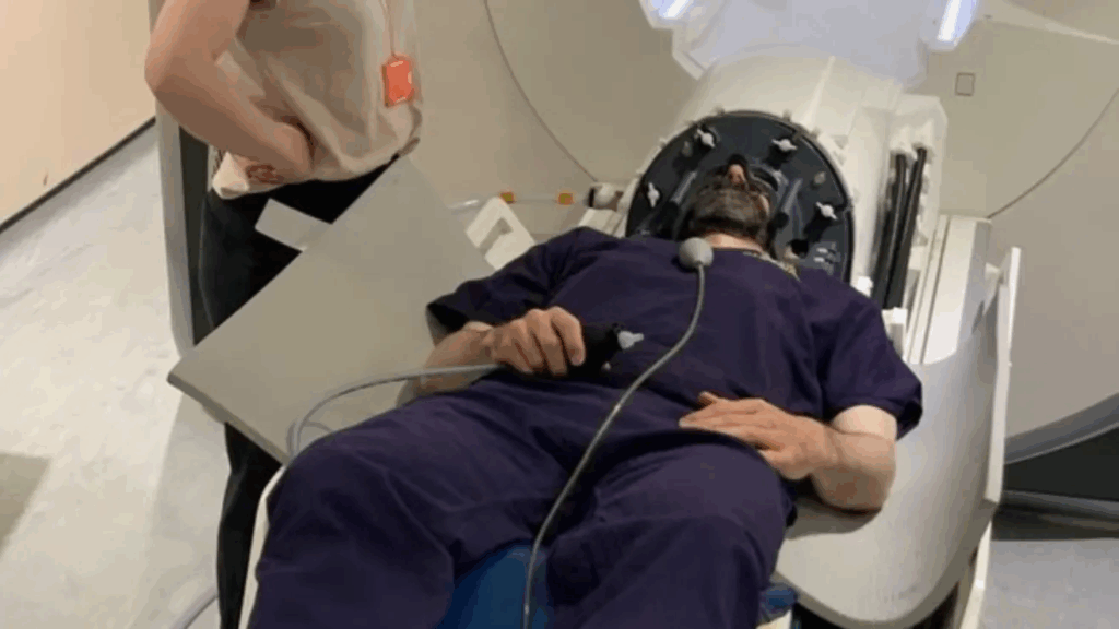 El paciente se acuesta boca arriba y desliza la cabeza dentro del casco, dijeron los investigadores en su artículo. Una mascarilla de plástico suave ayuda a mantener la cabeza quieta durante el tratamiento de ultrasonido.